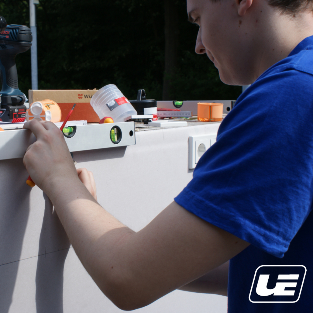 Es ist noch kein Meister vom Himmel gefallen. Und auch für unsere Auszubildenden heißt dies üben. Eines der grundlegenden Tätigkeiten eines Elektrotechnikers ist das Einsetzen und Montieren von Schuko Steckdosen und Schaltern. Hier noch zum Üben am Bretterturm. Natürlich bei schönstem Sonnenschein unter freiem Himmel.